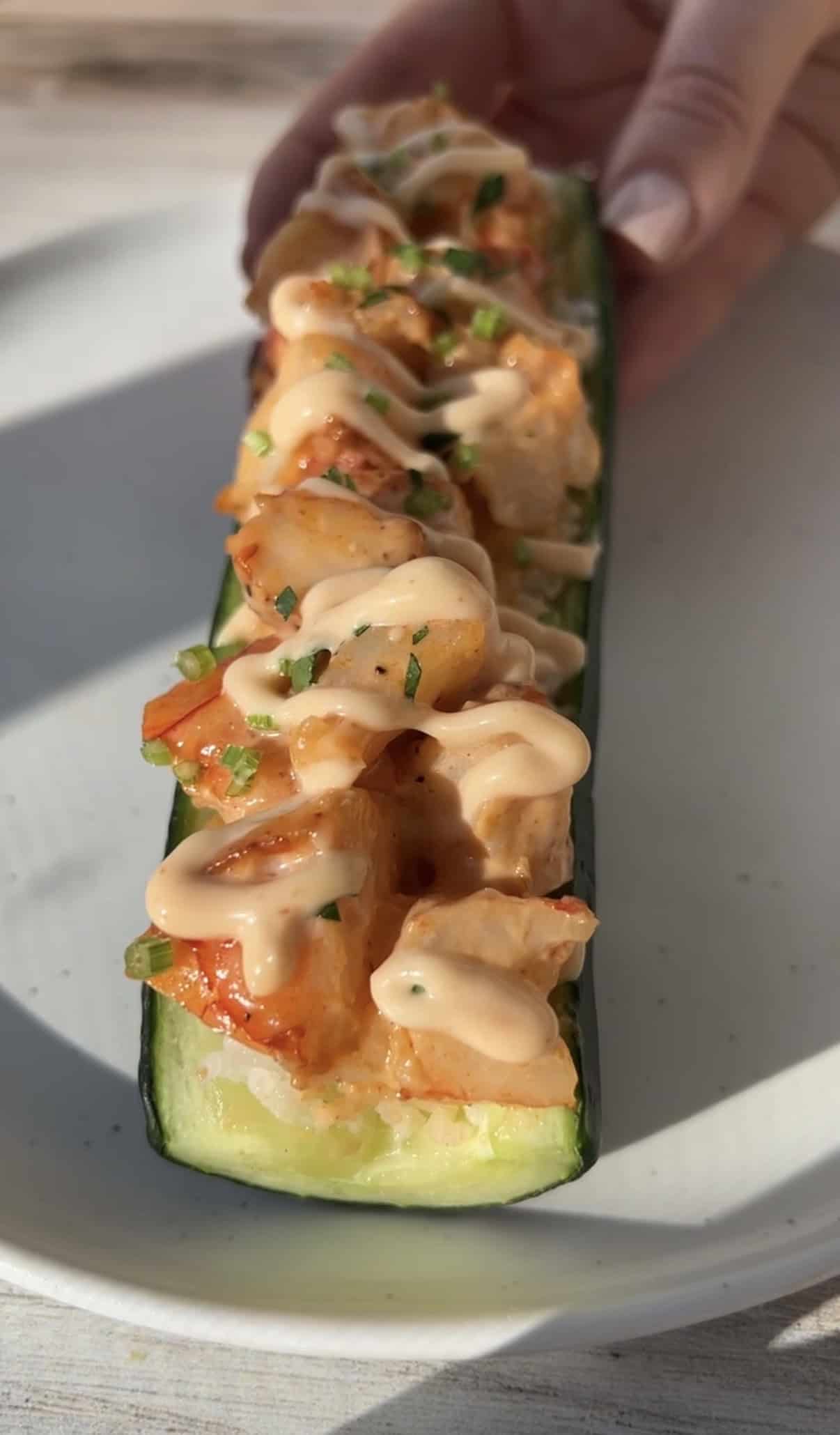 - NOTE: Alternatively, you can place the whole shrimp on the cucumber boat without cutting it and drizzle with spicy mayo on top. If you want my spicy mayo recipe, you can find it HERE