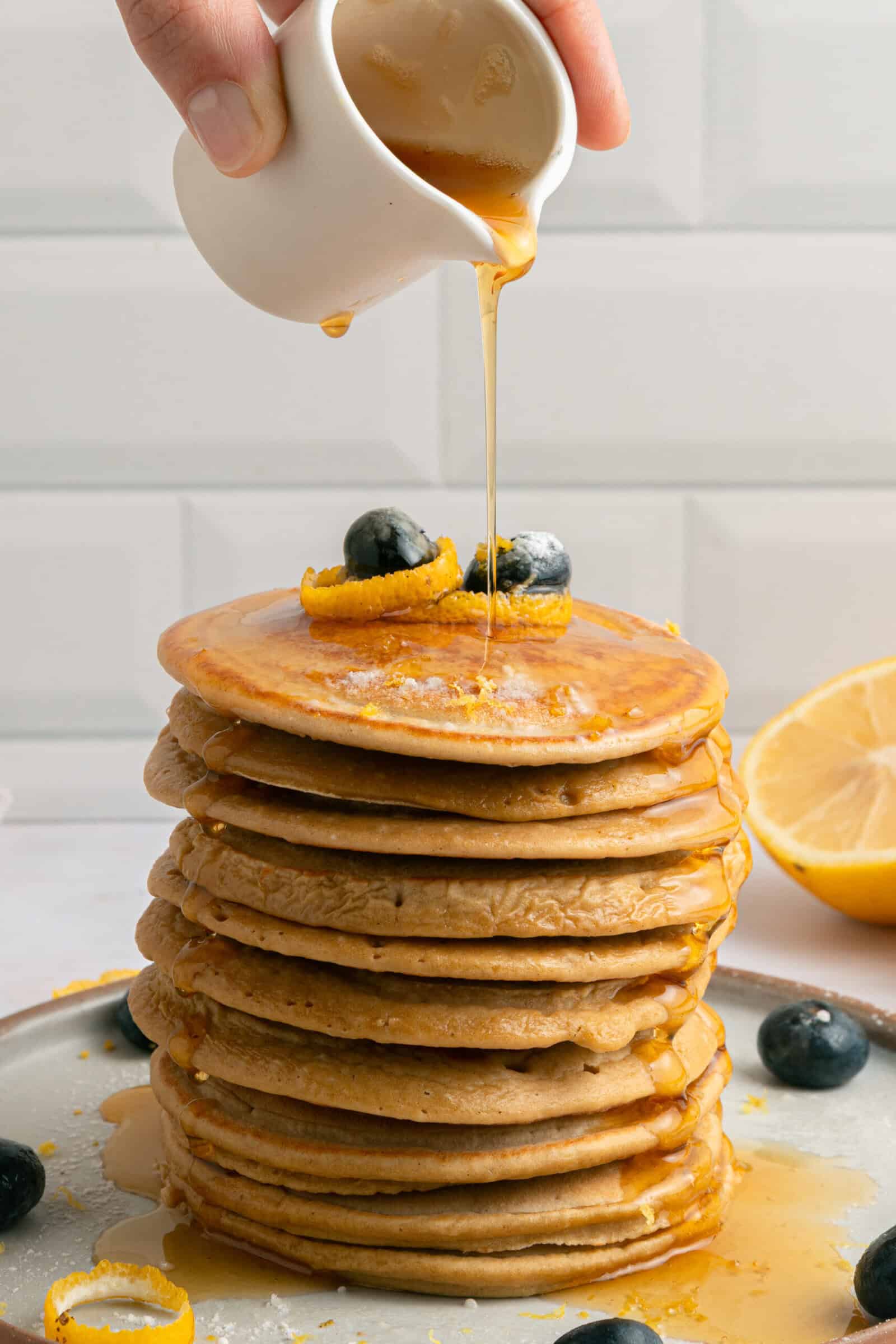 These pancakes are perfect for meal prep: you can make the batter 2 days ahead of time and store in the fridge. Alternatively, you can cook and freeze the pancakes and reheat them individually in the microwave or on a pan over medium-high heat.