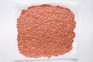 - Note: Keep a small bowl of water (or oil) nearby to dip your fingers — it helps keep the meat from sticking. Press and spread the meat into a thin, even rectangle. Repeat this step for the second portion of meat.