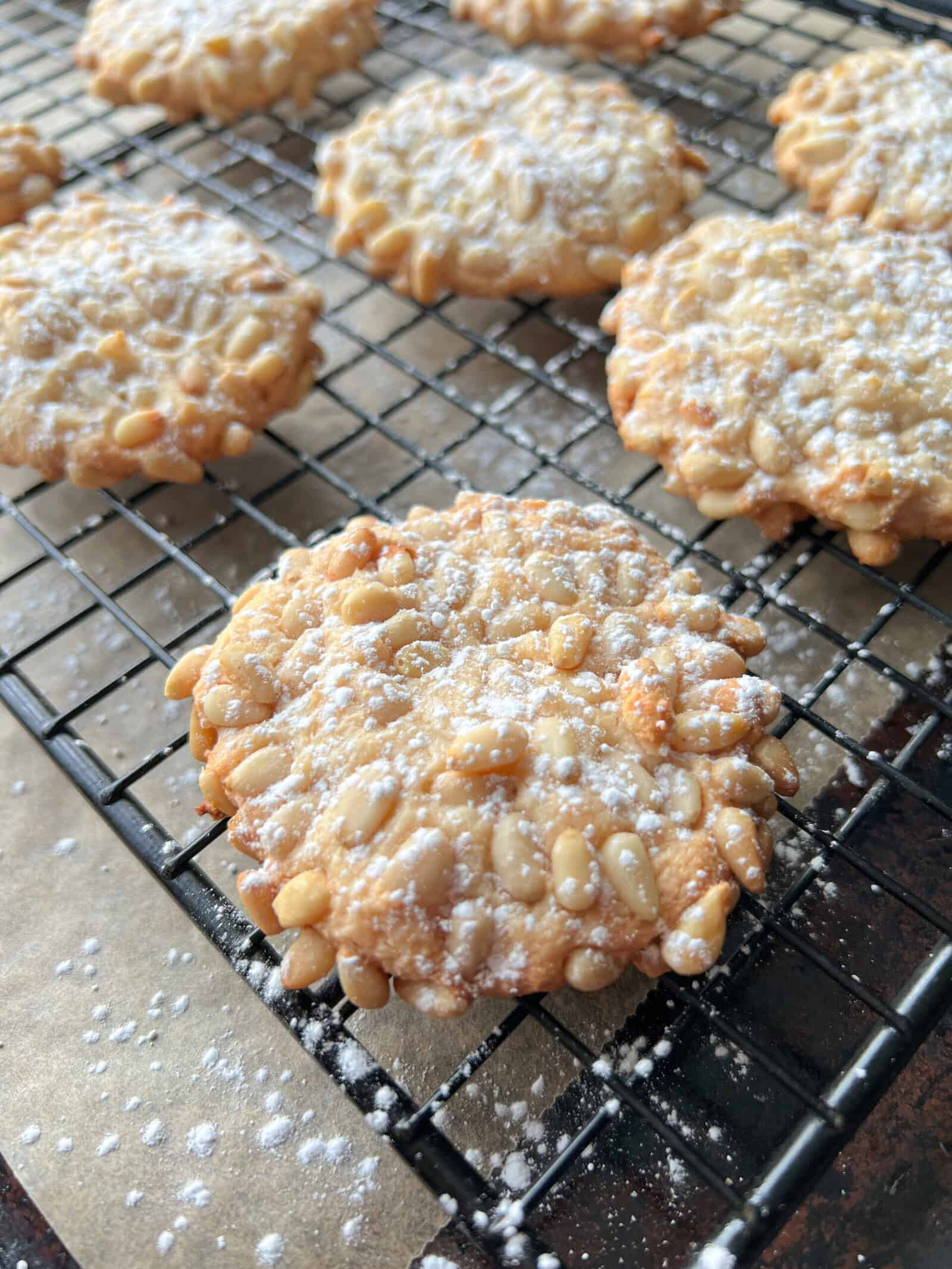 Baking the cookies for an extended period will yield a crispier texture, and they will continue to firm up further as time passes post-baking. To achieve soft and chewy Pignoli Cookies, I recommend baking them until the pine nuts just begin to take on a golden hue or the cookies have lightly golden bottoms.