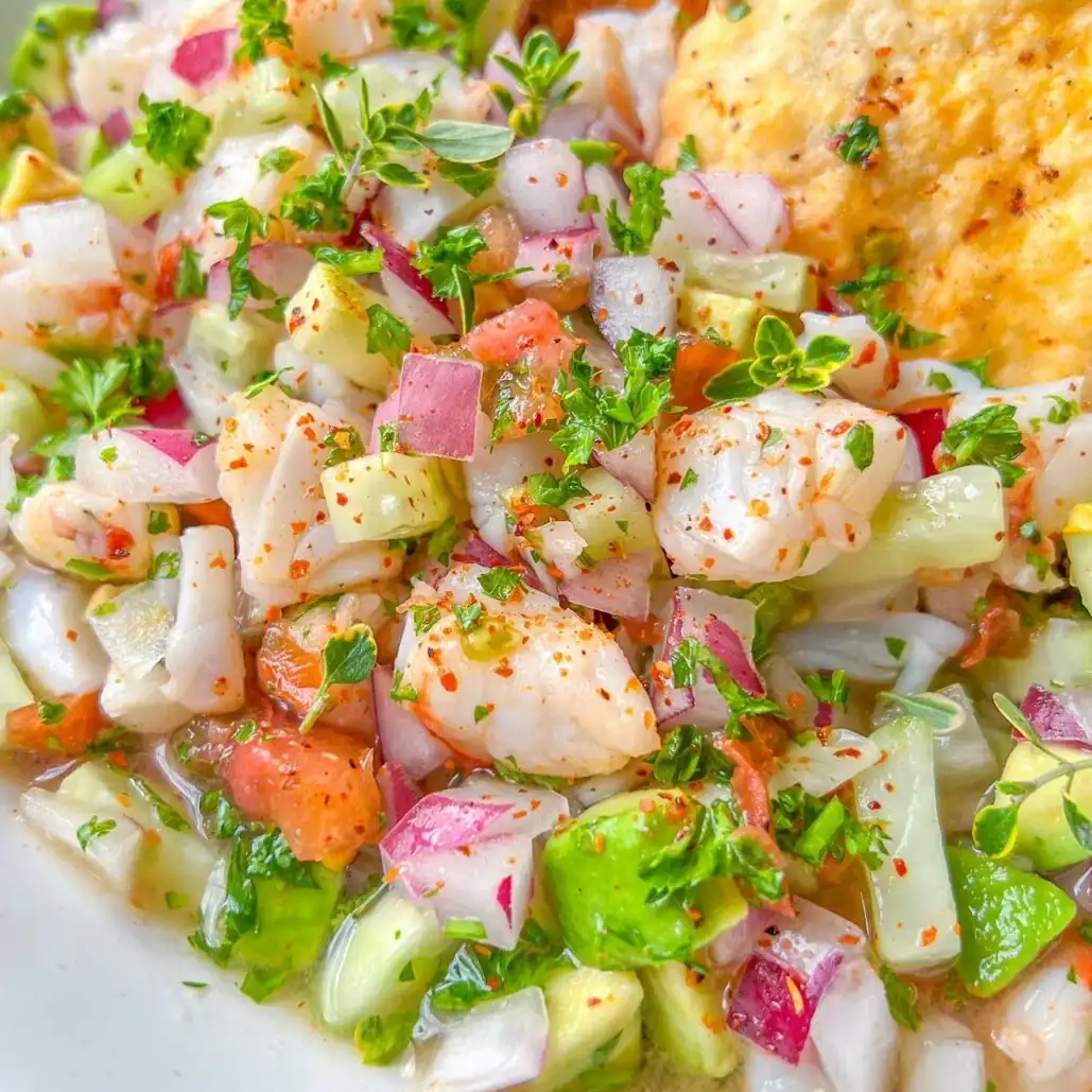 🔥 Mix well and serve Shrimp Ceviche immediately with tortilla chips or tostadas, adding hot sauce on top if desired.