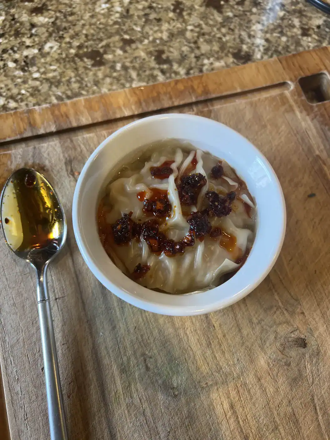 A small white bowl of dumplings in broth, inspired by the VIRAL PORK DUMPLING LASAGNA trend, is topped with chili oil and sits on a wooden cutting board. A metal spoon coated with chili oil rests beside it on a granite countertop.