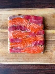 To assemble, place a piece of plastic wrap into a 9 by 9 square dish, making sure to cover the bottom and sides. Add the sushi-grade fish, alternating pieces of salmon and tuna until you have a nice even layer covering the bottom of the dish.