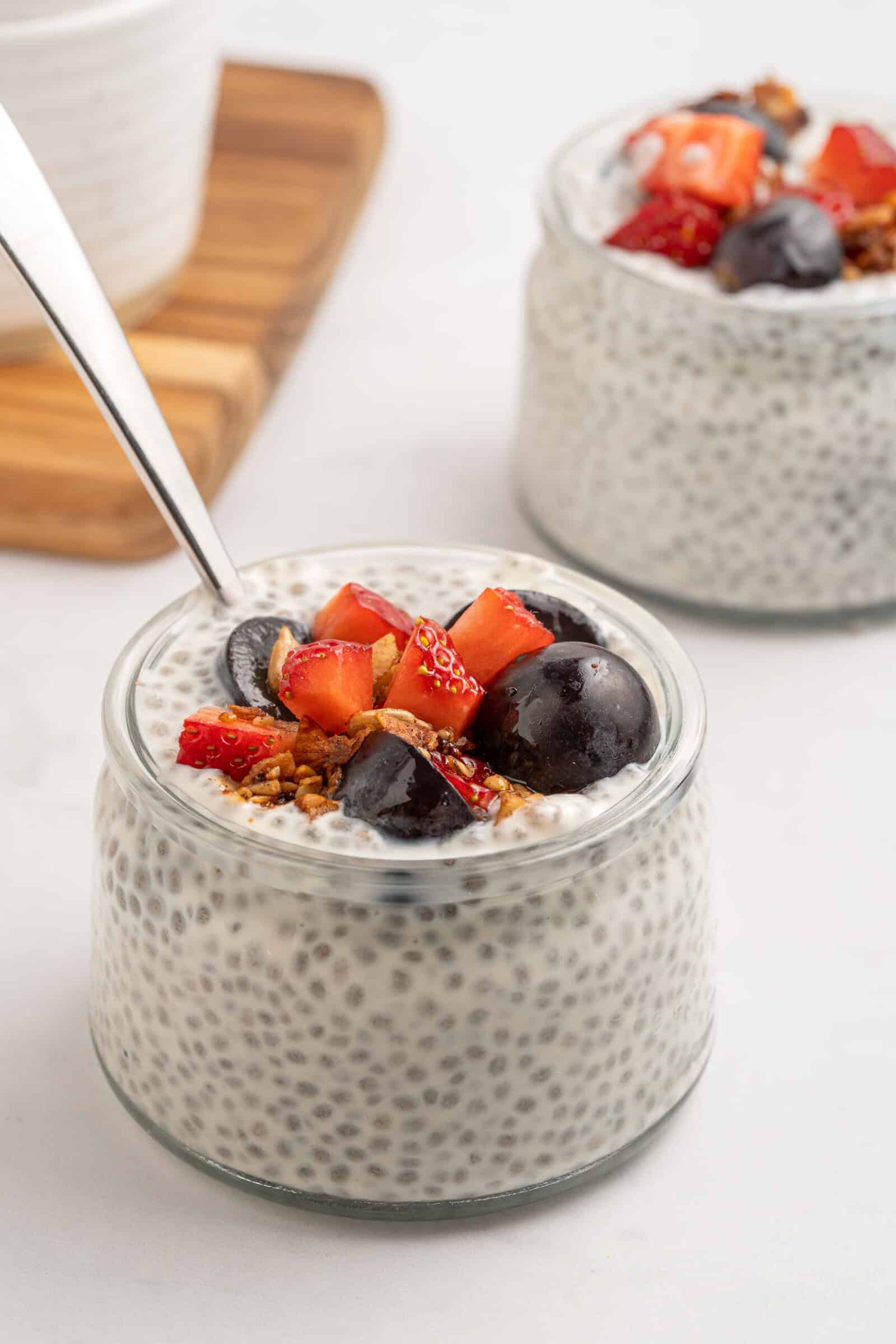 If you love tapioca, then you’ll love my yogurt chia pudding! The small black seeds expand in liquid 💧, which in turn, thickens the dish. Chia has a similar mouthfeel to tapioca, in that they pop a bit when chewed on. If you are not a fan of the texture of chia seeds, you can blend 🌀 this pudding recipe after the chia has absorbed the liquid and expanded. This method gives you a creamy and smooth consistency, while retaining all the nutritional benefits. The options for toppings are endless, but fresh berries 🍓 and granola are usually my go-to’s. Let’s make it 👩🍳!